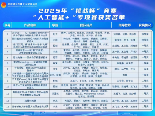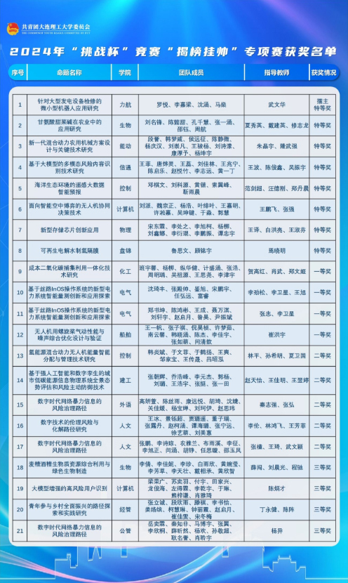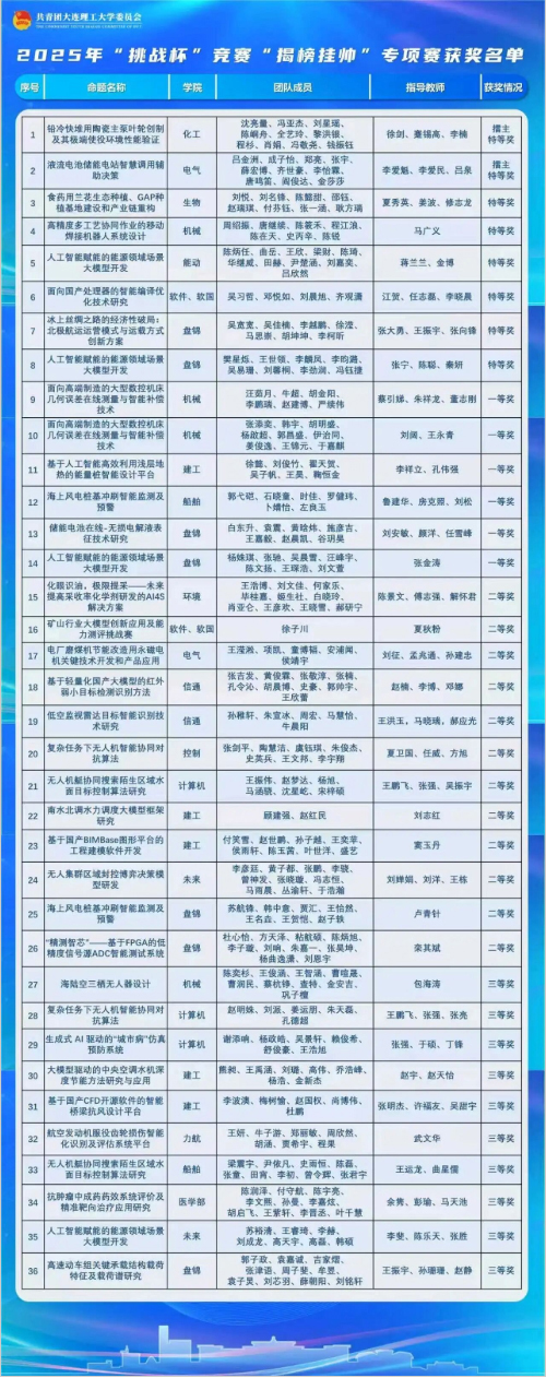 今年,在“挑战杯”2025年度中国青年科技创新“揭榜挂帅”擂台赛中,大连理工大学共61个团队报名,覆盖37个题目,取得擂主2项、特等奖8项、一等奖6项、二等奖12项、三等奖10项等36项奖励。此前,在本届“挑战杯”竞赛2024年度“揭榜挂帅”专项赛中,大连理工大学共获得擂主1项、特等奖8项、一等奖4项、二等奖5项、三等奖4项。