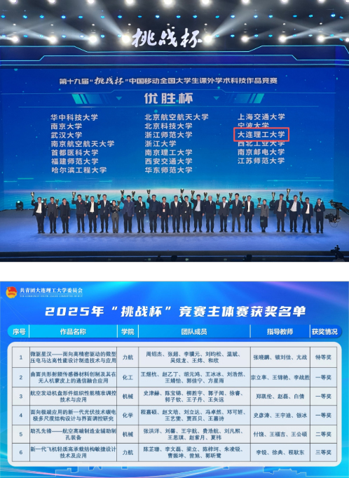 11月3日晚,第十九届“挑战杯”中国移动全国大学生课外学术科技作品竞赛终审决赛在南京大学圆满落幕。大连理工大学代表团在主体赛中斩获特等奖1项、一等奖3项、二等奖1项、三等奖1项;在“人工智能+”专项赛中取得特等奖2项、一等奖6项、二等奖5项的优异成绩,以全国高校第十名的成绩再次捧得“优胜杯”。