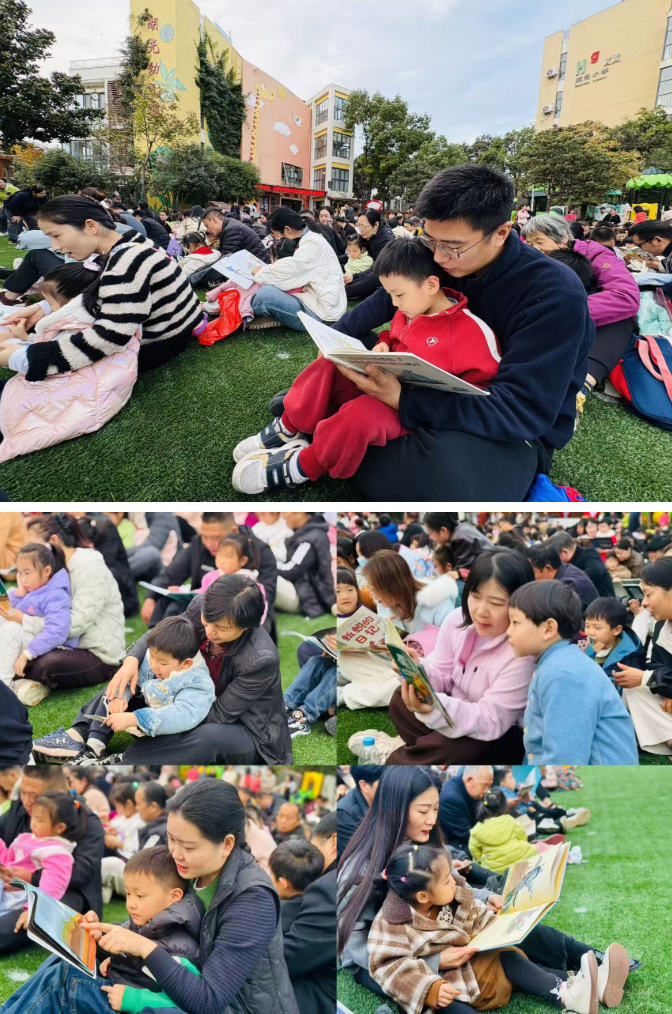 活动的核心环节——草坪读书会,将氛围推向高潮。伴随着舒缓的音乐,家长们或盘腿而坐,将孩子轻揽入怀;或并肩相依,让宝贝舒适地靠在自己身旁。他们翻开绘本,轻声讲述。十分钟里,没有喧闹,只有弥漫在空气中的亲情与专注。当故事讲完,家长们不约而同地给予拥抱和赞扬,“宝贝,你真棒”的鼓励声在草坪上响起,孩子们脸上绽放出自豪的笑容,阅读的快乐与亲情的温暖在此刻完美交融。