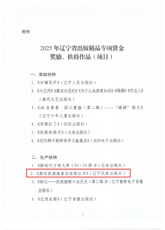 近日,中共辽宁省委宣传部公布2025年度辽宁省出版精品专项资金奖励、扶持作品(项目)名单。渤海大学校长赵建国教授主编,与辽宁民族出版社策划的《高句丽渤海普及读物丛书》入选。