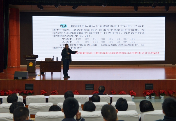 开幕式后,系列精彩活动同步启动。华中师范大学胡典顺教授为校本部清北班、竞赛班、东校区尖子生及两校区数学教师带来专题讲座《数学知识的整体性认识》。讲座中,他以“方差”为切入点,结合日常生活实例,用诙谐幽默的语言解读统计知识的来源与特点,引导师生在具体问题中感悟数学思维的精髓,让在场听众受益匪浅。