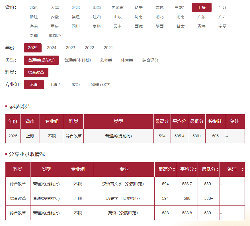 华东师范大学2025年分数线(上海 普通类(提前批) 综合改革)