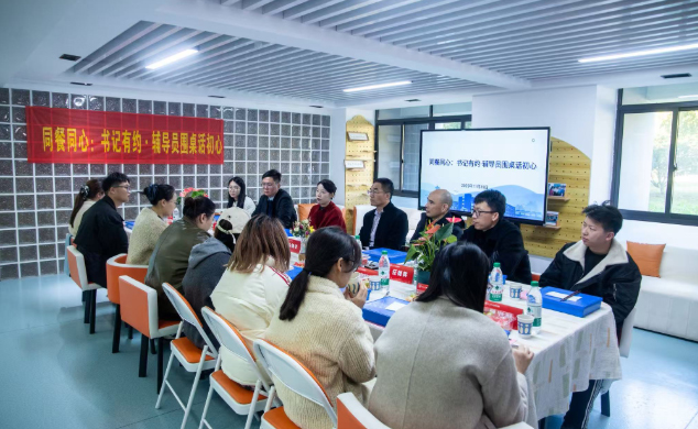 为深入贯彻落实立德树人根本任务,进一步加强辅导员队伍建设,凝聚育人共识,激发队伍活力,11月20日中午,浙江工商大学杭州商学院在书院一站式学生社区师生共叙室举办“同餐同心:书记有约·辅导员围桌话初心”辅导员团队建设餐叙活动。学院党委书记金锦华、党委副书记章晓乐出席活动,学生处处长李霞主持餐叙活动,各二级学院及学生处辅导员代表参加。