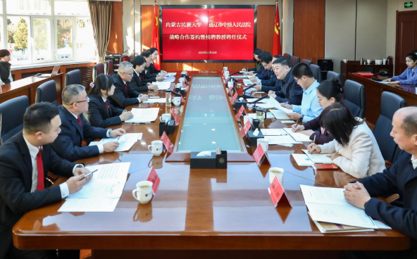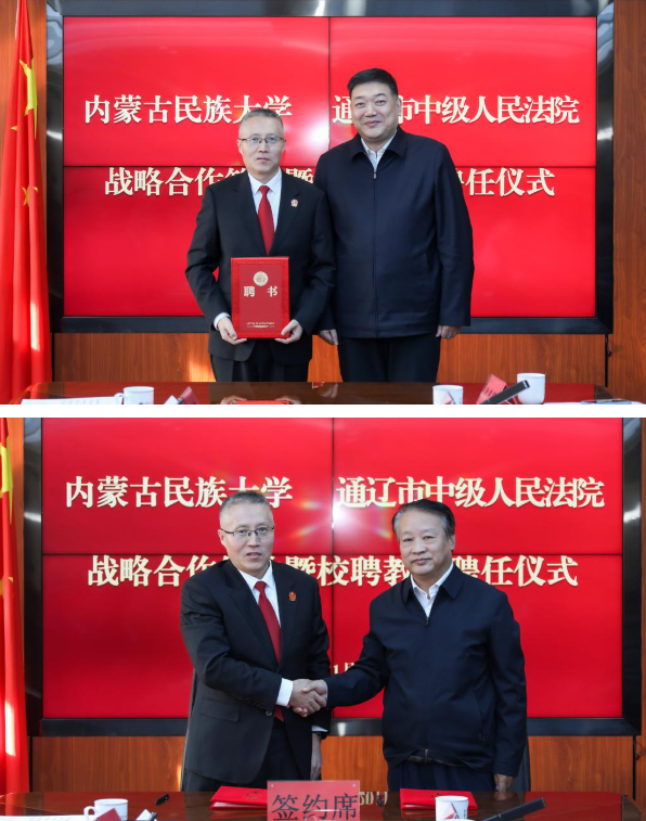 11月20日上午,内蒙古民族大学与通辽市中级人民法院战略合作签约暨校聘教授聘任仪式在霍林河校区励志楼213会议室举行。校党委书记赵东海,校党委委员、副校长陈英松,校党委委员、副校长裴志利;通辽市中级人民法院党组书记、院长徐延成,党组成员、政治部主任杜祎,党组成员、副院长韩静华,副院长杨敬明参加会议。陈英松主持会议。