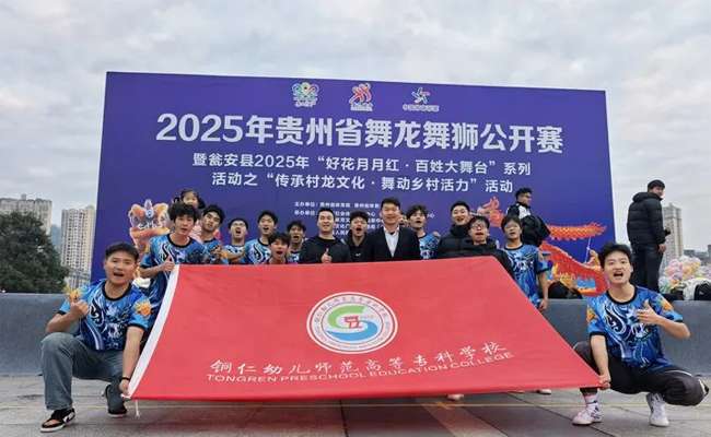 2025年贵州省舞龙舞狮公开赛于近日在黔南布依族苗族自治州举办,本次赛事由贵州省体育局、贵州省体育总会联合主办,吸引了来自全省多所本科院校、专科院校及社会组织的代表队同场竞技。铜仁幼儿师范高等专科学校首次选派男子舞龙队参与该项省级赛事,凭借整齐的节奏、流畅的动作和富有感染力的现场演绎,最终荣获二等奖1项、三等奖3项,展现出不俗的竞技水平和团队协作能力。