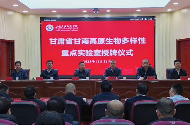 11月26日,甘肃省甘南高原生物多样性重点实验室授牌仪式在甘肃民族师范学院图书馆学术报告厅举行。甘南藏族自治州人民政府州长杨武、州政府秘书长旦智杰出席,甘肃民族师范学院党委书记高君智,党委副书记、校长贡力,党委委员、副校长李锦煜参加。仪式由州委常委、副州长蒲北辰主持。杨武为重点实验室依托单位授牌。贡力为重点实验室主任、副主任颁发聘书。