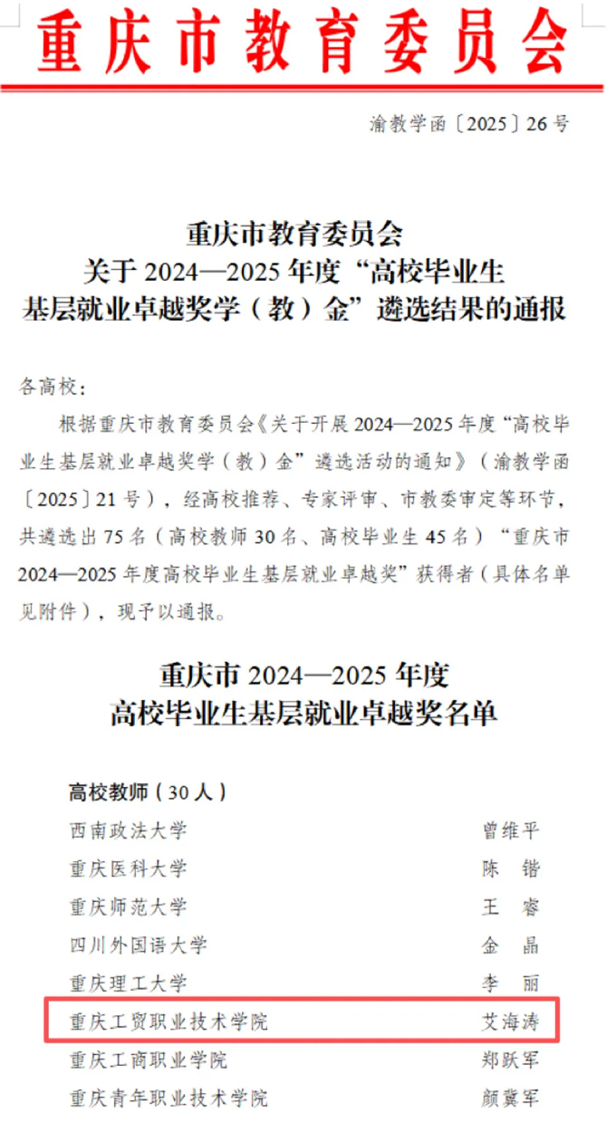 近日,重庆市教育委员会印发《关于2024—2025年度“高校毕业生基层就业卓越奖学(教)金”遴选结果的通报》(渝教学函〔2025〕26号),公布了获奖人员名单。其中,重庆工贸职业技术学院财经学院党总支书记、副院长艾海涛同志荣获“高校毕业生基层就业卓越奖”,成为重庆工贸职业技术学院本年度唯一获此殊荣的教师。