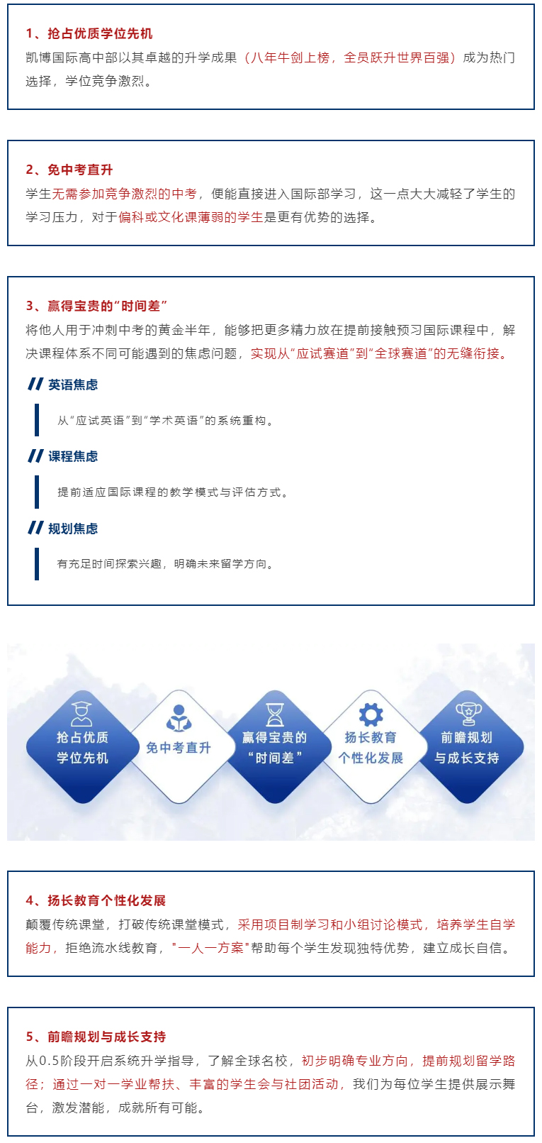 在中考升学路径日趋多元的今天,越来越多的家庭选择在国际与国内教育的十字路口,为孩子寻找一条更具潜力、更能激发内驱力的道路。凯博学校0.5+3衔接课程,致力于为九年级下学期的学生提供一片以学生为中心、以扬长为目标、以学习力为土壤的教育生态,旨在用关键的半年时间,完成学术、语言和思维的全方位过渡,学生能够更好地融入国际高中的学习氛围,为未来的海外求学打下坚实的基础。