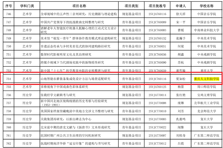 近期,教育部社会科学司发布了《教育部社科司关于2025年度教育部人文社会科学研究一般项目立项的通知》(教社科司函〔2025〕16号),重庆人文科技学院建筑与设计学院夏如松老师主持的《山地智能农耕装备集成化设计方法与场景适配研究》课题获批立项青年基金项目。