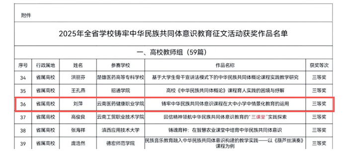 近日,云南省教育厅与省民族宗教事务委员会公示2025年全省学校铸牢中华民族共同体意识教育征文活动获奖名单。本次活动共征集稿件6217篇,经多轮评审,639篇作品脱颖而出。云南医药健康职业学院马克思主义学院教师刘萍的论文《铸牢中华民族共同体意识课程在大中小学中情景化教育的运用》荣获高校教师组三等奖。