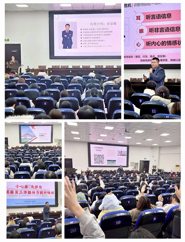 为进一步提升心理委员的工作能力与专业素养,筑牢校园心理健康防护网,2025年12月16日,湖北生态工程职业技术学院心理健康教育中心特邀中南财经政法大学心理中心副教授、注册心理师余金聪,于学校三号报告厅开展“小心委 大作为—心理委员工作胜任力提升培训”花山有声素质教育讲堂,活动由校心理健康教育中心教师黄翠芳主持,全体心理委员、心理部成员及学生骨干共同参与。