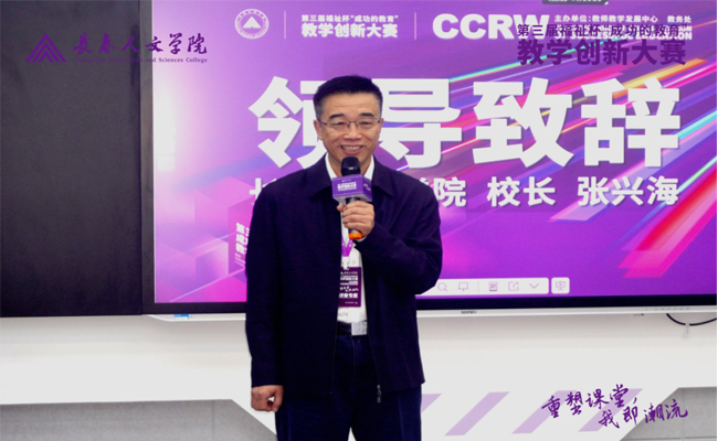 决赛开幕式由校长张兴海致辞。他强调,面对教育现代化与高质量发展的新要求,全体教师应主动拥抱变革,将信息技术、学科前沿与育人实践深度融合,在课堂教学中持续探索创新路径,真正构建以学生为中心、以成效为导向的教学新生态。同时,他勉励参赛教师充分发挥水平、展现教学实力,在竞赛中相互学习、共同进步。