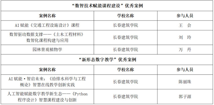 近日,高校在线开放课程联盟联席会发布《关于推荐“第六届全国智课教育创新大会暨高校在线开放课程联盟联席2025年会”会议交流成果的通知》,长春建筑学院高度重视、积极部署,组织教师精准申报、精心打磨,最终有5门AI赋能课程凭借鲜明的创新特色、扎实的教学成效成功入选大会交流展示优秀案例。