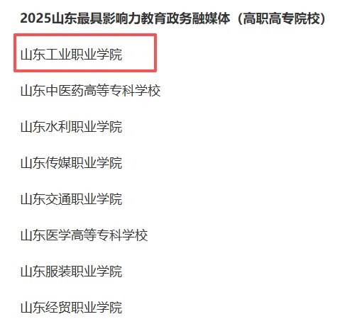 12月17日,山东省互联网传媒集团正式发布2025年度山东高校系列榜单。山东工业职业学院获评“2025山东最具影响力教育政务融媒体”。