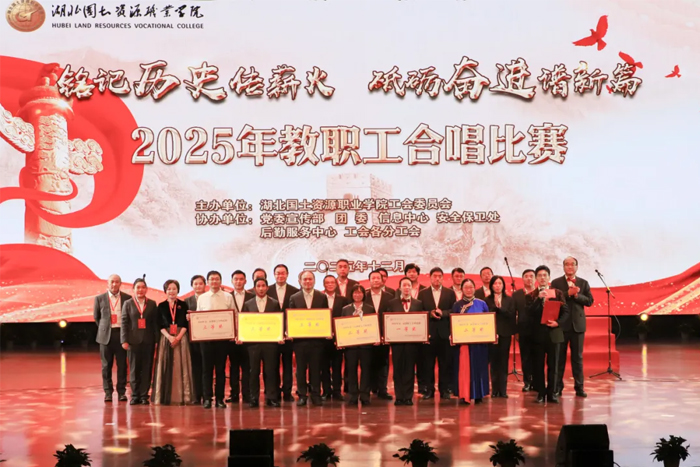 为隆重纪念中国人民抗日战争暨世界反法西斯战争胜利80周年,弘扬伟大抗战精神,展现全体教职工团结进取、昂扬向上的精神风貌,12月24日,湖北国土资源职业学院在大学生活动中心大礼堂举行主题为“铭记历史传薪火 砥砺奋进谱新篇”2025年教职工合唱比赛。全体校领导、工会主席,全校500名教职工齐聚一堂,以歌叙史,以声言志,共同奉献了一场融艺术性、思想性与教育性于一体的高水平文化盛宴。
