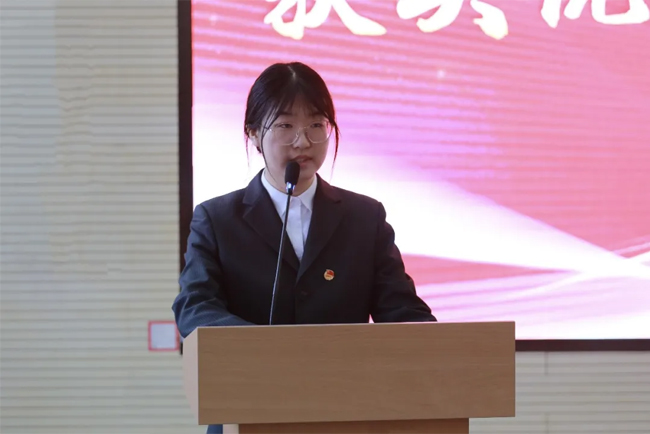 劳动经济管理学院23人力6班高琪同学作为“国家奖学金”获奖代表发言,她将荣誉视为责任,以预备党员身份激励自己,并分享了其通过“较真”治学、服务集体、竞赛淬炼所取得的成长。