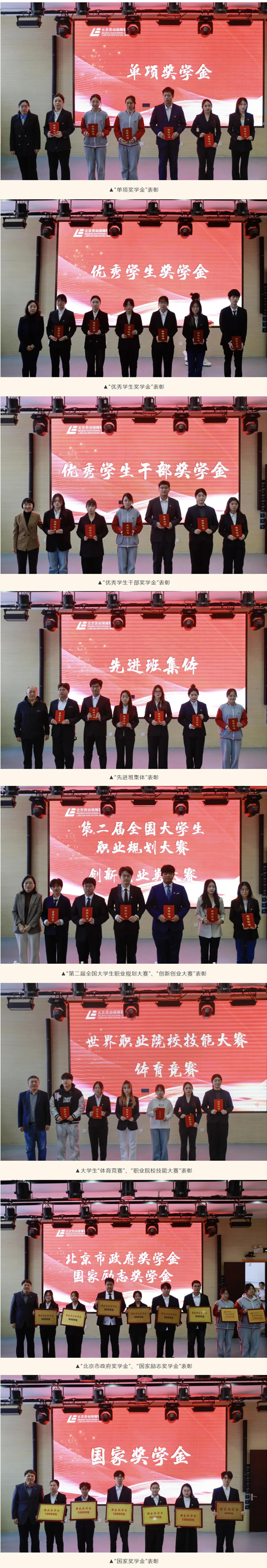 本次大会对大学生“单项奖学金”、“优秀学生奖学金”、“优秀学生干部奖学金”、“先进班集体”、“第二届全国大学生职业规划大赛”、“创新创业大赛”、“职业院校技能大赛”、大学生“体育竞赛”、“北京市政府奖学金”、“国家励志奖学金”、“国家奖学金”进行了表彰。