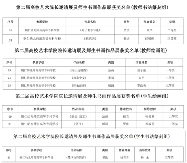 近日,由省教育厅主办的“贵州省第二届高校艺术院长邀请展及师生书画作品展”获奖结果揭晓,铜仁幼儿师范高等专科学校师生共斩获8项奖项,其中一等奖1项、二等奖2项、三等奖5项。