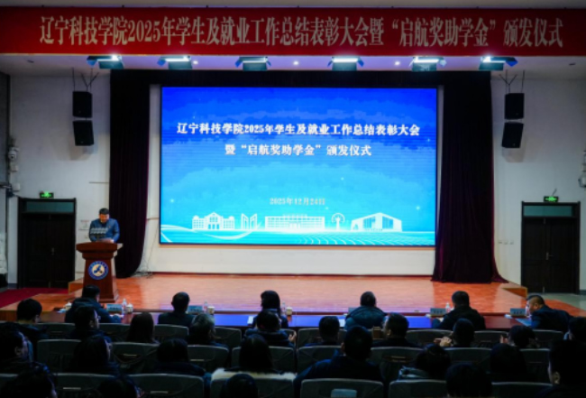 冬蕴华章襄盛举,薪火相传向未来。12月24日,辽宁科技学院在勤公楼一楼学术报告厅举行2025年学生及就业工作总结表彰会暨“启航奖助学金”颁发仪式。会议全面回顾2025年学生及就业工作丰硕成果,擘画了“十五五”期间育人工作的发展蓝图,并对先进集体、个人及优秀学子进行了表彰。辽宁科技学院党委书记赵毅、副校长葛会奇,石钢京诚装备技术有限公司人力资源部部长何伟鹏,广州启航物联佳业集团有限公司总经理李洪光、常务副总经理姜立中参会。学校相关职能部门负责人、各二级学院领导班子成员、全体辅导员及师生代表齐聚一堂,共话育人成效,共绘发展蓝图。