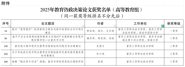 近日,重庆市教育委员会发布《关于2025年教育咨政决策论文获奖情况的通报》(渝教策函〔2025〕18号),重庆工贸职业技术学院在此次全市范围的高水平论文征集评选中表现亮眼,共遴选报送6篇教育咨政决策论文,最终5篇脱颖而出,分获一等奖1项、二等奖2项、三等奖2项,获奖率高达83.3%。