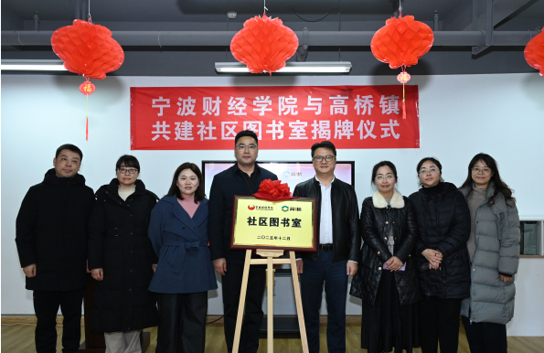 12月26日下午,宁波财经学院与高桥镇在学院社区举行共建图书室揭牌仪式。本次活动由宁波财经学院图书馆和高桥镇共同主办,旨在深化校地合作,推动全民阅读,打造“家门口”的文化阵地。高桥镇党委副书记、镇长王南鹤,宁波财经学院副校长许锁迪,高桥镇党委委员徐汪毓出席,宁波财经学院图书馆负责人及高桥镇相关工作人员参加。宁波财经学院师生代表及学院社区相关居民代表等参与了相关活动。