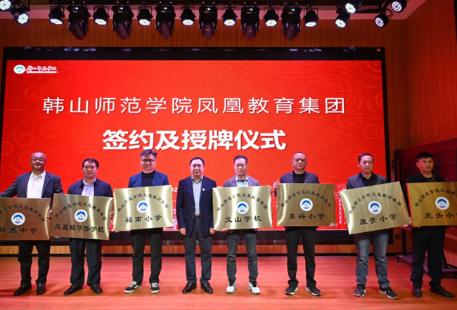 “韩山师范学院凤凰教育集团”签约及授牌仪式上,刘海春、周归宇、吴伟阳代表三方现场签约。新成立的凤凰教育集团包括凤凰中学、凤凰镇华侨学校、福南小学、文山学校、东兴小学、康美小学、虎头小学等7所学校,将作为总集团框架下专注于乡村教育振兴的“改革示范区”,探索构建“高校—地方政府—公益基金会—成员学校”四方联动的治理新模式。