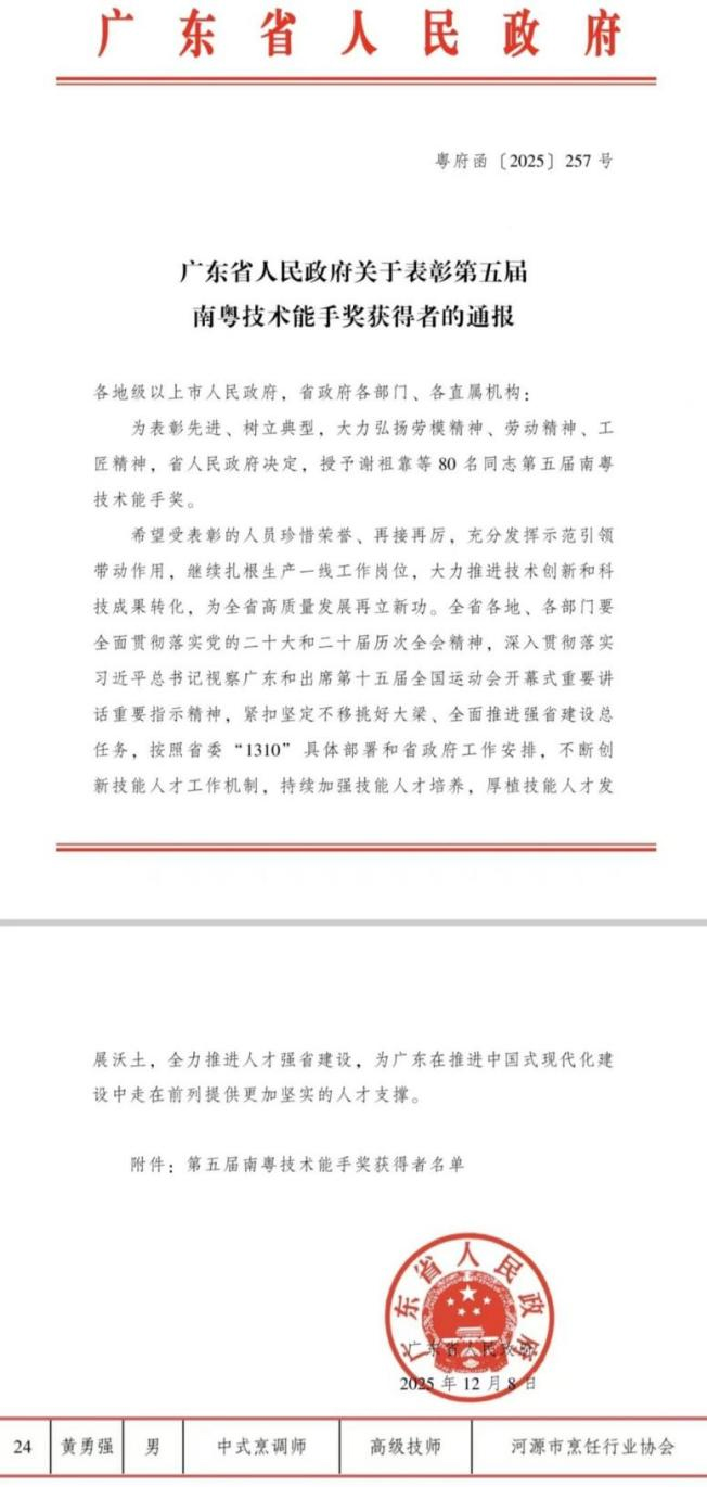 日前,广东省人民政府印发《关于表彰第五届南粤技术能手奖获得者的通报》(粤府函〔2025〕257号),河源职业技术学院工商管理学院烹饪工艺与营养专业教师黄勇强荣获“第五届南粤技术能手奖”。