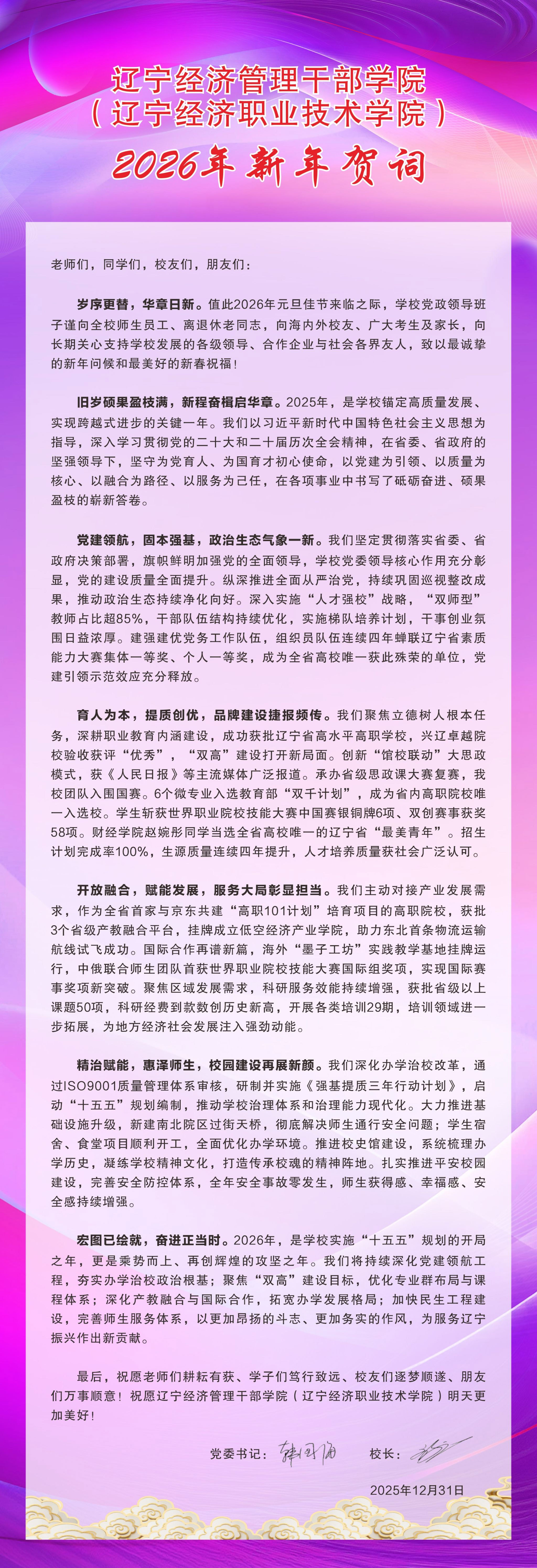 辽宁经济管理干部学院(辽宁经济职业技术学院)2026年新年贺词