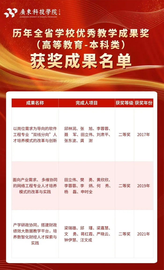 此次获奖成果涵盖育人模式创新、产教融合协同育人、专业认证与人才培养、多维度实践教学体系构建等多个方面,充分体现了广东科技学院以学生为中心、深化教学改革、服务区域发展的办学理念与实践成效。这些荣誉的取得,既是学校近年来持续完善教学建设系列制度,不断优化教育教学环境的成果,也彰显了广东科技学院教师在教学改革中勇于探索、追求卓越、勤于思考、善于总结、乐于推广的精神风貌,并将进一步推动广东科技学院教育教学质量迈向更高的阶梯。
