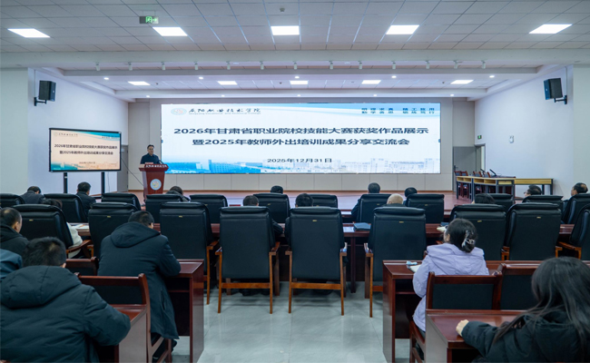 2025年12月31日,庆阳职业技术学院在庆阳市公共实训基地开放型区域产教融合实践中心召开2026年甘肃省职业院校技能大赛获奖作品展示暨2025年教师外出培训成果分享交流会。学院党委书记张建军,党委副书记、院长胡志玉等班子成员及全体教师参会,会议由党委委员、副院长杨三宁主持。