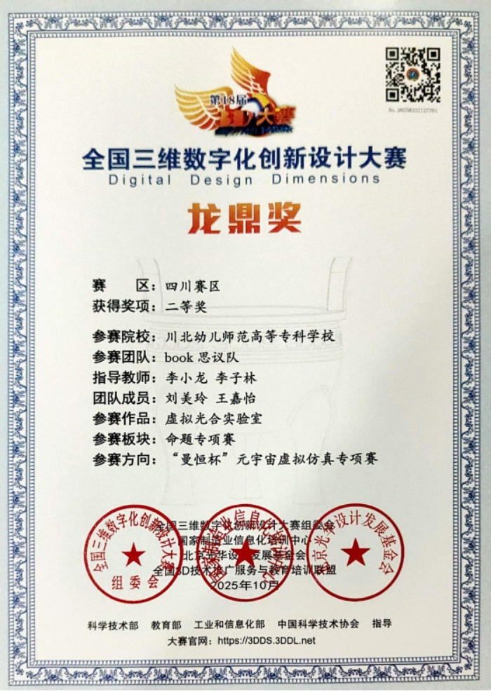近日,2025第18届全国三维数字化创新设计大赛“曼恒杯”元宇宙虚拟仿真专项赛落下帷幕。川北幼儿师范高等专科学校学子组建的两支参赛队伍凭借扎实的专业能力与创新的设计理念脱颖而出,斩获全国二等奖,充分展现了川北幼儿师范高等专科学校在数字化创新人才培养领域的显著成效。