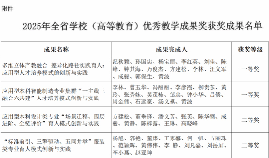 由国际时尚设计学院牵头完成的《“标准前引、三擎驱动、五同并举”服装类专业育人模式创新与实践》获得二等奖。该成果基于“标准前引、三擎驱动、五同并举”育人模式,围绕服装产业数字化、智能化转型需求,通过引入行业标准引领专业建设,以“人文、技术、项目”三擎驱动课程体系重构,依托校企“同谋专业、同设实验室、同建师资、同研课程、同评学生能力”深化产教融合,系统破解了传统培养模式与产业的结构性脱节问题。经过十余年的探索与实践,显著提升了人才培养质量,学生竞赛获奖丰富、就业率高,教学资源与专业建设成果突出,得到媒体广泛报道,并在多所高校推广应用。