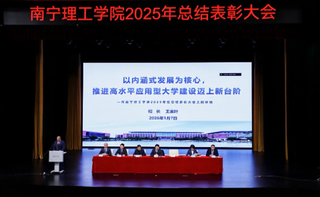 1月7日上午,南宁理工学院2025年总结表彰大会在南宁校区东盟大剧院、桂林校区1626报告厅同步召开。学校领导班子成员与全体教职工齐聚一堂,全面盘点2025年发展成果,表彰先进典型,共绘发展蓝图。大会由学校党委书记、督导专员金飞主持。