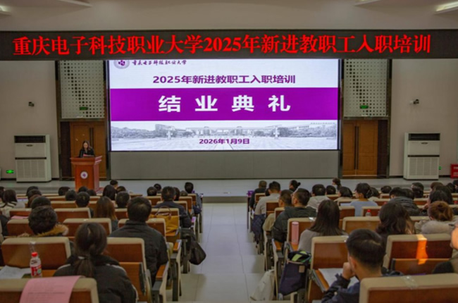 1月9日下午,2025年新进教职工入职培训结业典礼在博远厅举行,重庆电子科技职业大学党委教师工作委员会组成单位、二级学院负责人、全体新进教师及指导教师代表等100余人参会,学校党委书记张伟,党委常委、副校长叶勇出席。