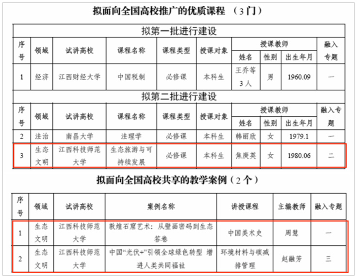 近日,教育部社会科学司印发《关于推进分领域思想专题教学讲义配套教学资源建设的函》(教社科司函〔2026〕1号),公布拟面向全国高校推广共享的优质课程和教学案例名单。在此次分领域思想专题教学讲义配套教学资源建设中,江西科技师范大学喜获佳绩:“生态旅游与可持续发展”课程入选“拟面向全国高校推广的优质课程”(第二批建设);“敦煌石窟艺术:从壁画密码到生态答卷”和“中国‘光伏+’引领全球绿色转型 增进人类共同福祉”两个教学案例入选“拟面向全国高校共享的教学案例”。据悉,此次全省高校共有3门课程入选优质课程,江西科技师范大学占1门;全省共有2个教学案例入选,均为江西科技师范大学报送,展现了江西科技师范大学在推动习近平生态文明思想有机融入专业课程教学方面取得的扎实成效与示范引领性。