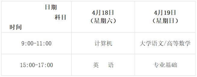 (四)考试时间。全省统一考试时间为4月18日、19日。具体考试时间与考试科目安排如下(北京时间):