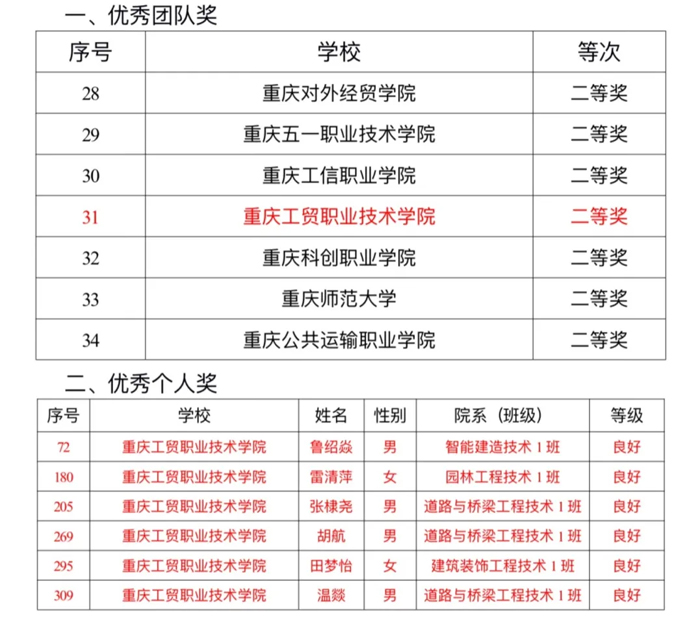 近日,由市教委主办、重庆第二师范学院承办的2025年国家学生体质健康标准达标比赛(普通高等学校组)在重庆第二师范学院顺利结束。经过参赛学子的努力拼搏,重庆工贸职业技术学院荣获优秀团队二等奖。在优秀个人奖中,重庆工贸职业技术学院建筑工程学院鲁绍焱、雷清萍、张棣尧、胡航、田梦怡、温燚等6名同学凭借出色的体能表现和顽强的拼搏精神,荣获良好等次,体现了工贸学子昂扬向上的精神风貌和良好的体质健康水平。