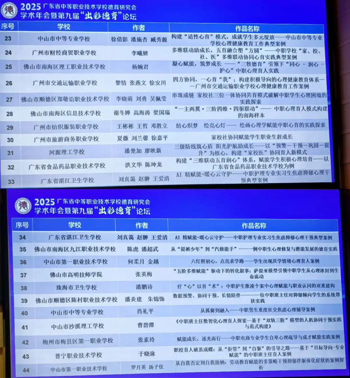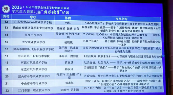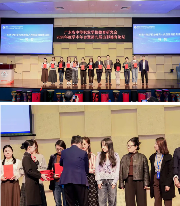 最后,在中职学校心理育人典型案例征集活动颁奖仪式中,会方公布了获得一等奖的名单。中山市中等专业学校报送的6篇案例中,徐倩影、潘施杏、臧秀源的学校心育工作典型案例《构建“适性心育”模式,成就学生多元绽放》、彭永红的心理健康教育主题班级活动设计案例《归位·破茧:以哪吒之魂绘绿漫之志》、肖礼平的班主任育人案例《从孤僻到融入——中职男生重度社交焦虑心理辅导案例》3个作品脱颖而出,荣获一等奖。据悉,本次案例征集活动共收到参评案例460余篇,一等奖获奖比例仅为15%,其余获奖名单待官方文件正式发布。