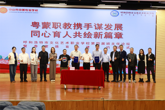 大寒时节,虽寒意袭人,但广东中山职业教育领域却涌动着一股暖流。为深入贯彻落实《粤蒙两省区深化战略合作框架协议(2023-2027年)》及《内蒙古自治区与广东省教育合作实施方案》文件精神,全面践行立德树人根本任务,2026年1月20日,呼和浩特市文化艺术职业学校(简称呼文艺校)一行54人莅临中山市中等专业学校(简称中山中专),共同举办了一场别开生面的班主任论坛暨德育共建签约仪式,为职业教育协同育人注入了新的活力与动能。