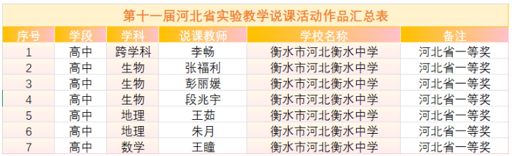 近日,从河北省教育厅传来喜讯,河北衡水中学教师凭借扎实的教学功底、创新的教学设计与精彩的实验展示,在第十一届河北省实验教学说课活动中脱颖而出,朱月、李畅、王瞳等7位教师成功斩获省级一等奖,充分彰显了河北衡水中学在实验教学领域的深厚积淀与育人成效。