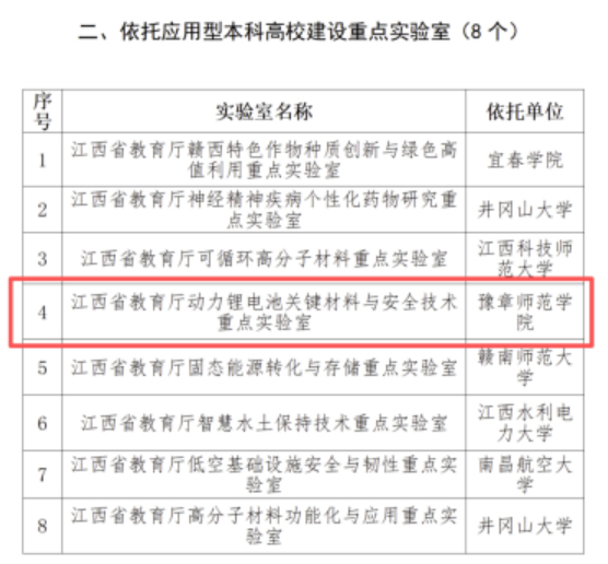 近日,江西省教育厅公布《关于公布江西省教育厅重点实验室(第二批)立项名单的通知》,豫章师范学院智能材料与新能源学院牵头申报的“江西省教育厅动力锂电池关键材料与安全技术重点实验室”正式获批立项。这是豫章师范学院首个省级重点实验室,不仅标志着学校在学科发展与科研平台建设领域实现历史性突破,更为学校高质量发展注入了强劲的创新动能。