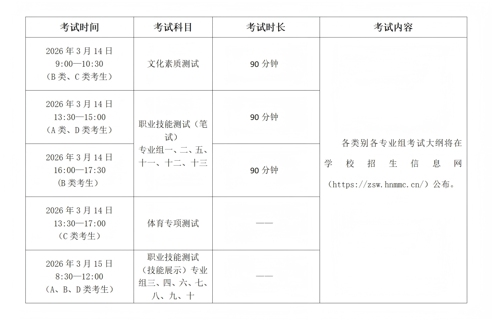 第二十条 我校将按照分类考试的原则,对不同招生类别的职业技能测试分类别进行命题。我校职业技能测试的有关说明、考试范围等,将在学校招生信息网(https://zsw.hnmmc.cn/)公布。