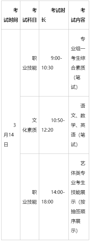 4.D类考生免予文化素质测试。职业技能测试由学校组织,重点考察学生的职业适应性和职业技能,满分300分。