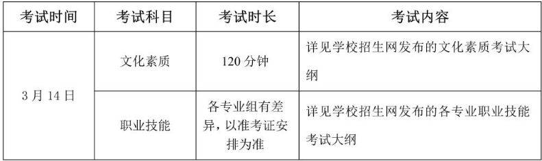 第二十条 我校将按照分类考试的原则,对不同招生类别(专业组)的职业技能测试分类别(专业组)进行命题。我校文化素质测试、职业技能测试的有关说明、考试范围等,将在学校招生网公布。