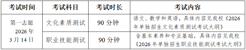 第二十二条 学校按第一志愿和第二志愿分别组织单招考试。第一志愿考试时间为2026年3月14日。若第一志愿生源不足,未完成单招计划,学校将组织第二志愿考试,参考对象为第二志愿报考了我校未完成计划专业且未被第一志愿学校录取的考生。第二志愿考试时间为2026年4月11日。各科目的具体考试时间及地点以准考证上载明的信息为准。