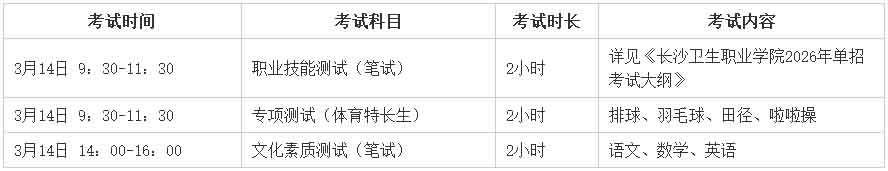 3.C类考生。由学校依据《长沙卫生职业学院2026年体育特长生高职单招方案》统一组织文化素质测试和专项测试。文化素质测试由学校依据《中等职业学校公共基础课课程标准》及高中教育阶段语文、数学、英语等有关内容进行命题及考试,采取笔试方式进行,满分300分。专项测试详见附件《长沙卫生职业学院2026年体育特长生高职单招方案》,满分300分。