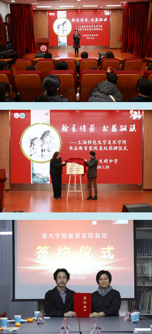 2026年1月26日,在辞旧迎新策马扬鞭之际,上海师范大学美术学院在上海市光明中学举行书法教育实践基地揭牌仪式。上海师范大学美术学院中国书画系副主任丘新巧教授与光明中学朱晓薇校长共同为“上海师范大学美术学院书法教育实践基地”揭牌。此次合作是两校在艺术“一条龙”书法项目人才培养模式上的一次探索。在2025年12月,两校已签署《上海师范大学教育实践基地协议书》。