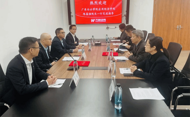 在万联证券广州白云分公司,于禄总经理及广州总部相关负责人对学院一行的到来表示热烈欢迎,并系统介绍了万联证券的发展历程、区域布局以及白云分公司在服务地方经济、投资者教育和金融实践方面的探索经验。企业方面表示,随着资本市场服务实体经济功能不断深化,对兼具专业素养与实践能力的应用型金融人才需求日益迫切,高校在人才供给侧具有不可替代的重要作用。