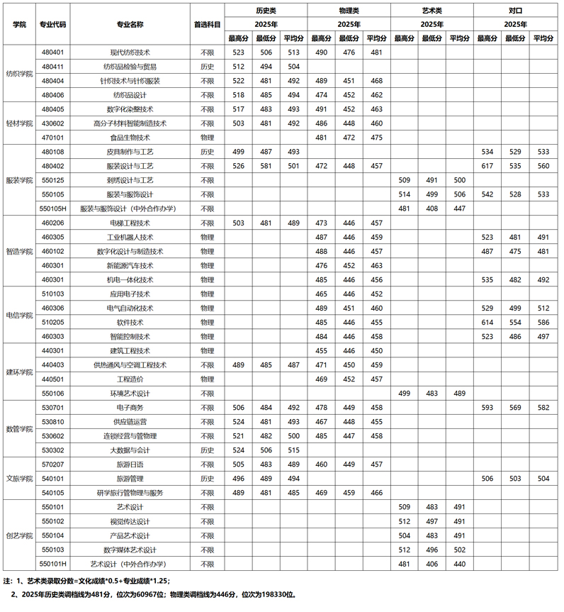 成都纺织高等专科学校2025年四川省分专业、分类别录取分数线