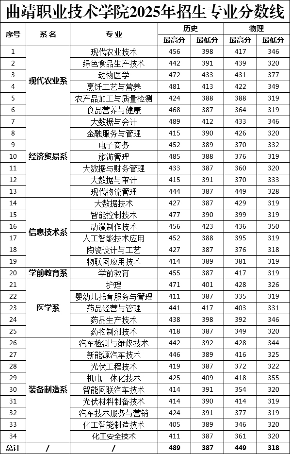 曲靖职业技术学院2025年统招三年制大专专业分数线